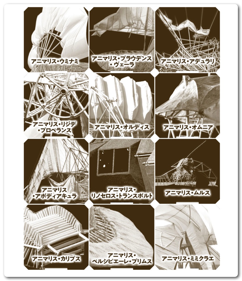 まだ本物は観たことがないのですが、いつか本物と出会う日を夢見て、写真や動画で作品を楽しんでいます。WEBサイトでは「アニマリス・ウミナミ」、「アニマリス・プラウデンス・ヴェーラ」、「アニマリス・アデュラリ」、「アニマリス・リジデ・プロペランス」、「アニマリス・オルディス」、「アニマリス・オムニア」、「アニマリス・アポディアキュラ」、「アニマリス・リノセロス・トランスポルト」、「アニマリス・ムルス」、「アニマリス・カリプス」、「アニマリス・ペルシピエーレ・プリムス」、「アニマリス・ミミクラエ」の12の作品が静止画と動画で鑑賞できます。どの作品も風力で動いているのですがまるで生き物のような複雑な動きで観るものを楽しませてくれます。実際に動いているのを観てみたい…。