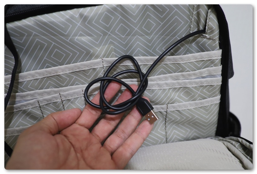 またUSBケーブルが内蔵されており、ここにモバイルバッテリーを入れた状態で外側にあるコネクタから充電をすることができます。