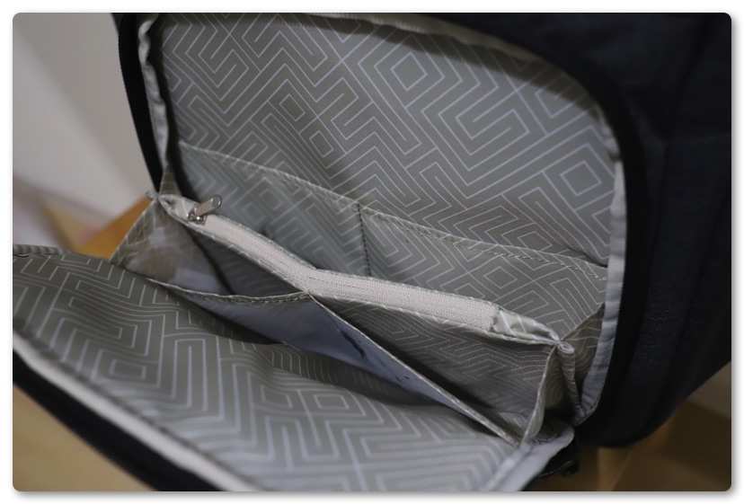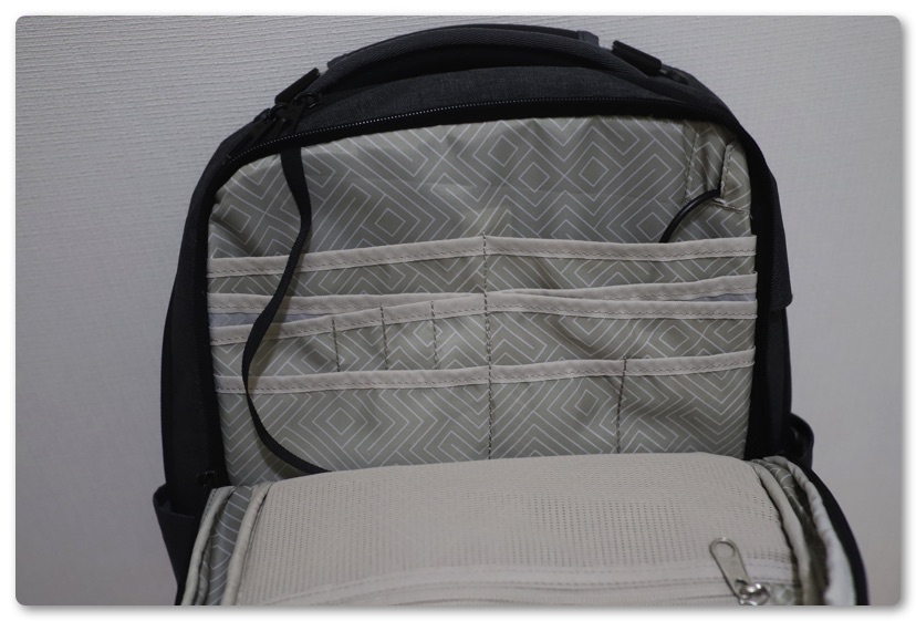 サードコンパートメントは小物を入れられる数多くのポケットとファスナー付きのポケットがあります。