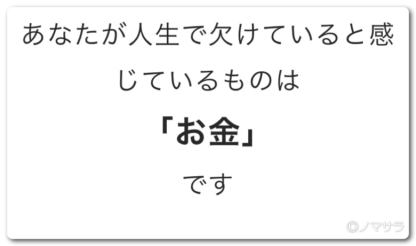 最後に『あなたが人生でかけていると感じているものは「お金」です』とのこと。お金に困ったことはないのですが確かにもう少しあればなぁと感じています。家族、友人、住環境、健康、知性などその他は満ち足りています。あとは多少使っても減らないぐらいのお金があればとは思いますが、そうなると人生完璧すぎるので、このぐらいでちょうどいいかもしれません。