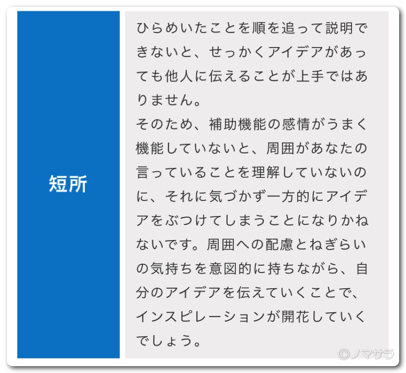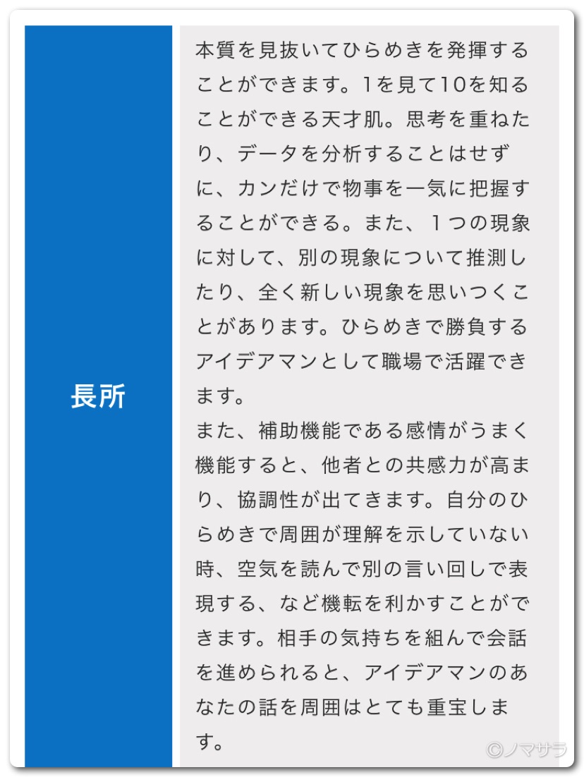 長所は下記の通り。確かにこの通りで何かと何かを繋げて新しいものを創造したりひらめいたりすることが得意。