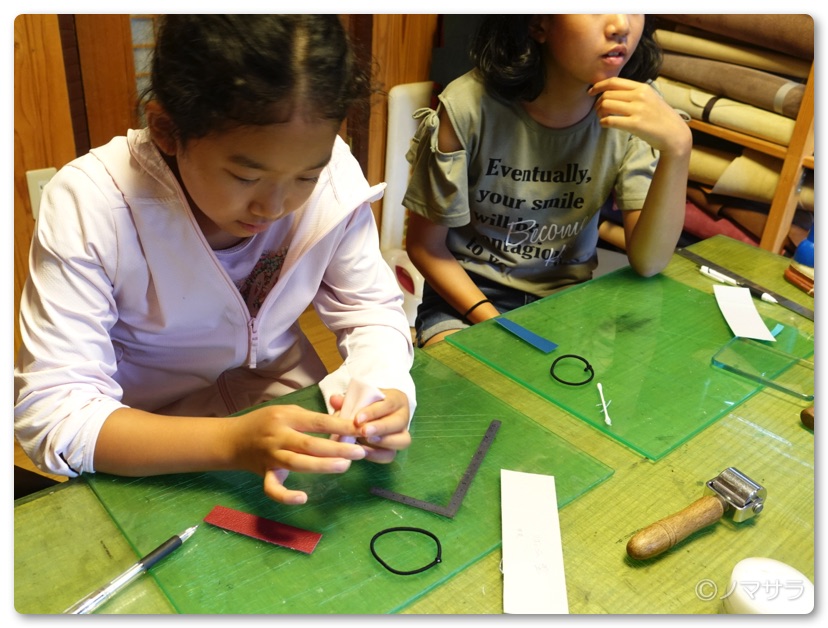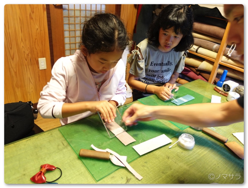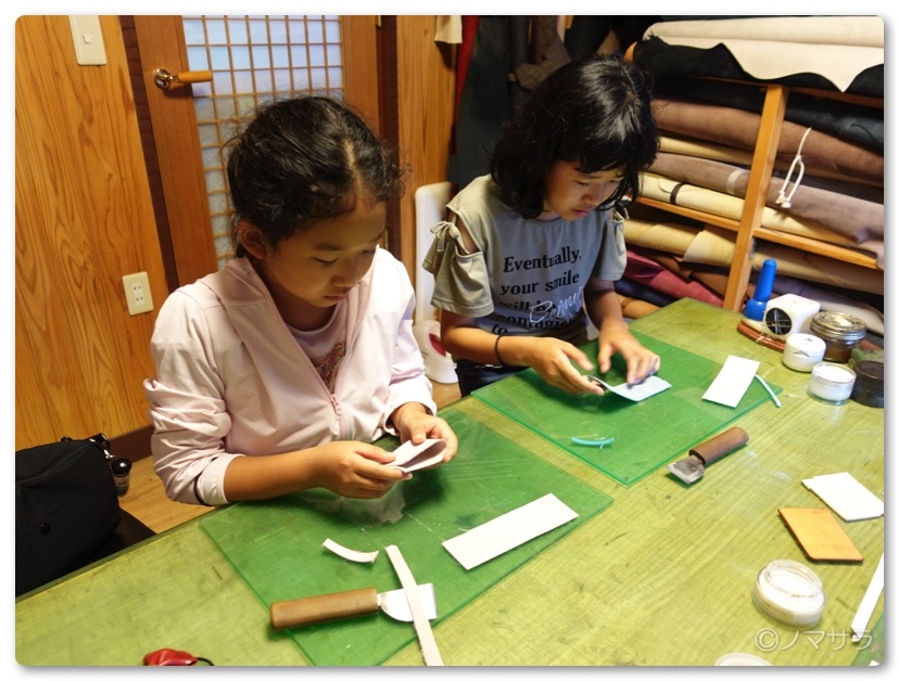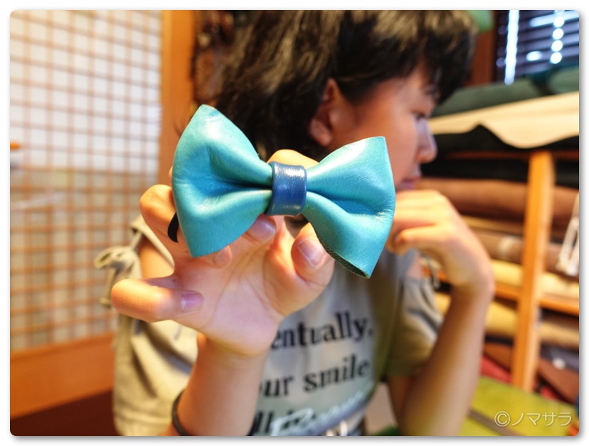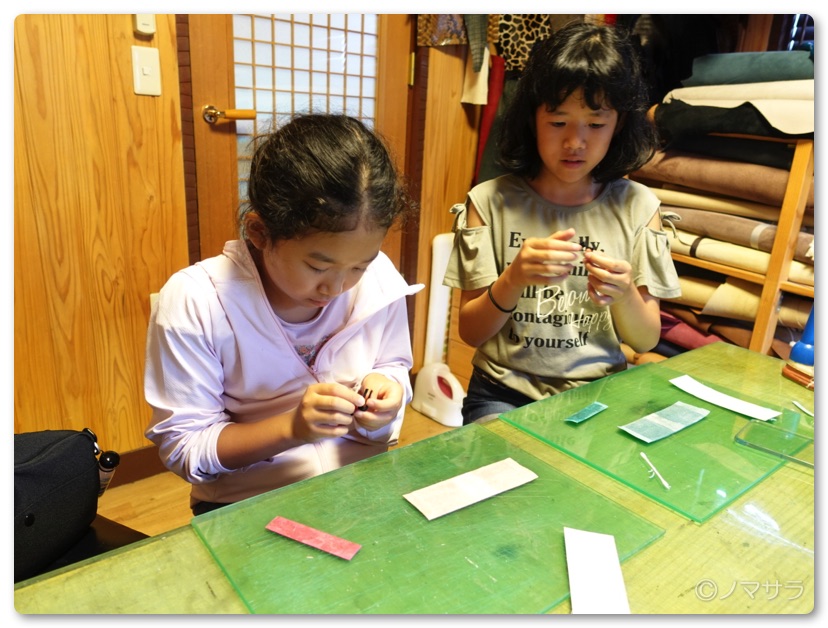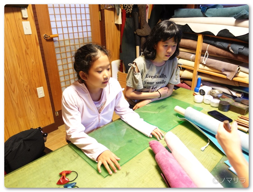 オーダーしたあと娘たちが革でできたリボンの製作体験をしたいとのことだったのでチャレンジしてみました。まずは革を2種類選びます。いつもの如く次女は全く迷いなく即決定。長女はあれこれ迷いながら5分ほどかけて選びました。同じように育ててますが違いがあってホント面白い。