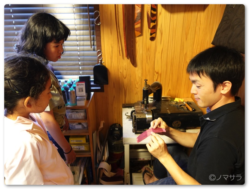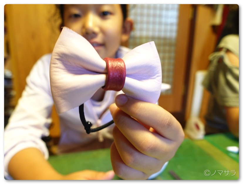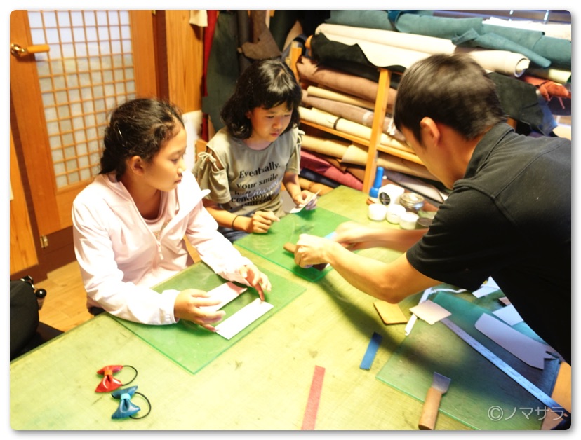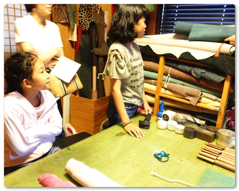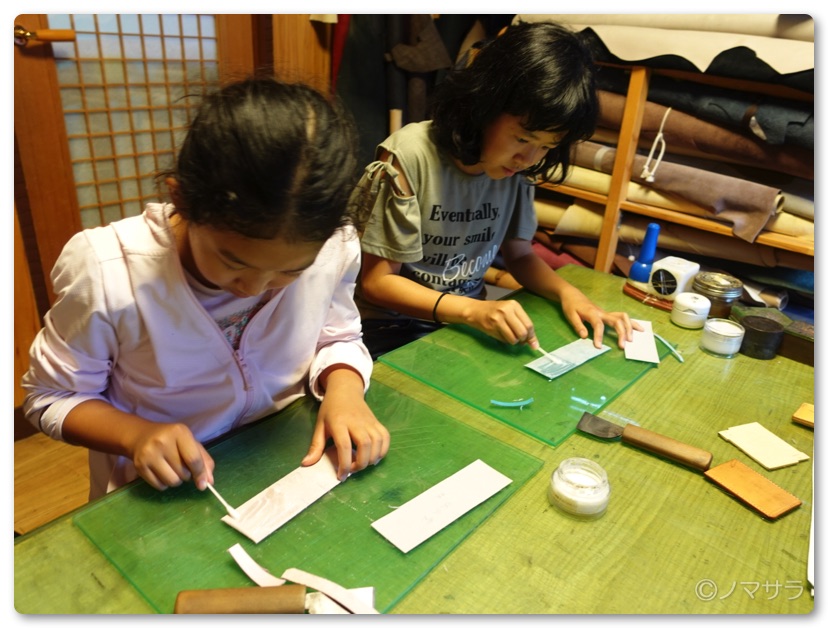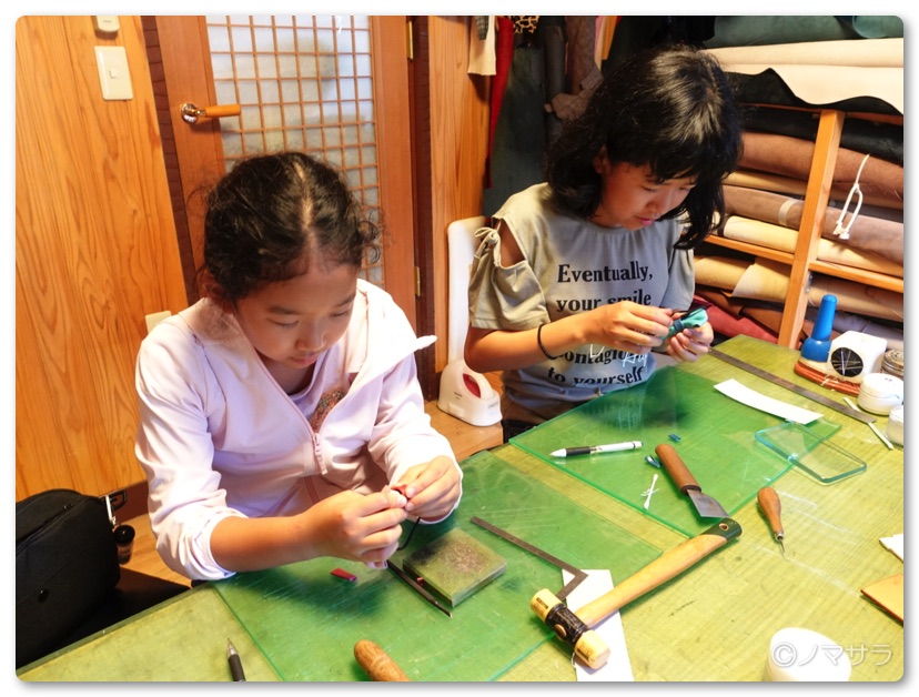 オーダーしたあと娘たちが革でできたリボンの製作体験をしたいとのことだったのでチャレンジしてみました。まずは革を2種類選びます。いつもの如く次女は全く迷いなく即決定。長女はあれこれ迷いながら5分ほどかけて選びました。同じように育ててますが違いがあってホント面白い。