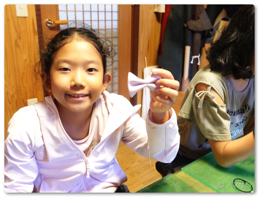 長女はスカイブルーにターコイズ、次女はパステルピンクにワインレッドのリボンをそれぞれ作りました。先生が優秀なので二人とも初体験ながらめっちゃ上手に出来上がりました。