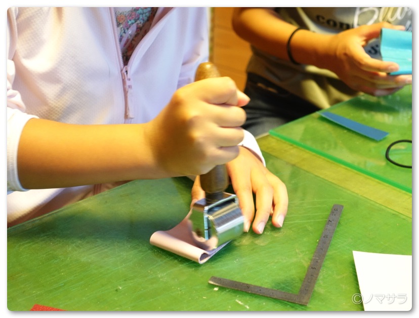 革を選んだら型紙に沿って裁断します。コテのような刃物で切断していきます。めっちゃ切れ味鋭いので手の位置には十分注意。
