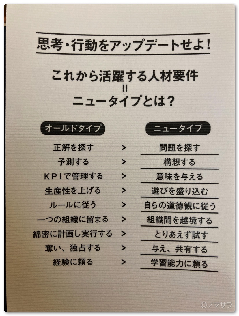 本の表紙の裏にも記載されていますが「オールドタイプ」から「ニュータイプ」へ思考・行動を変容させる必要があります。