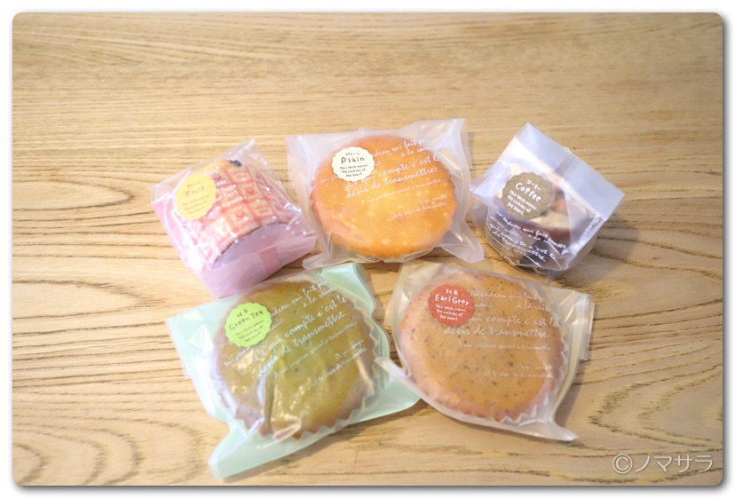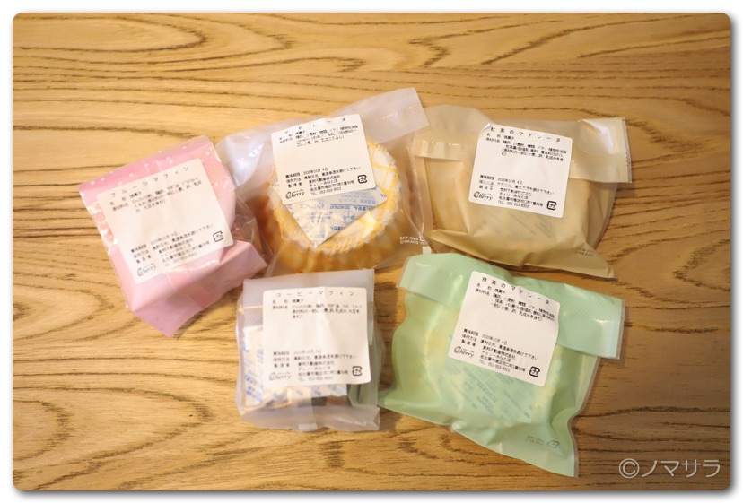 マドレーヌが3つとマフィンが2つ。しかもどれも無添加で安心して食べられます。コンビニでこの手のお菓子の原材料を見るとマーガリンをはじめ、防腐剤や人工甘味料、合成着色料のオンパレード。その点「チェリー」の焼き菓子はきちんと作られています。