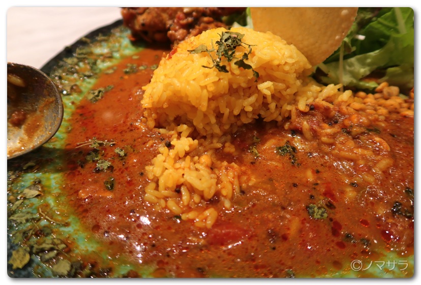 ライスは長粒米(インディアカ米)のターメリックライス。これがスパイスカレーのルート抜群に合います。自宅ではハウスジャワカレーをアレンジした「情熱大陸カレー」を作りますがこのカレーはドロッとしたジャパナイズカレーなので普通のお米が合いますが本格的なスパイスカレーにはやはり長粒米がベスト。