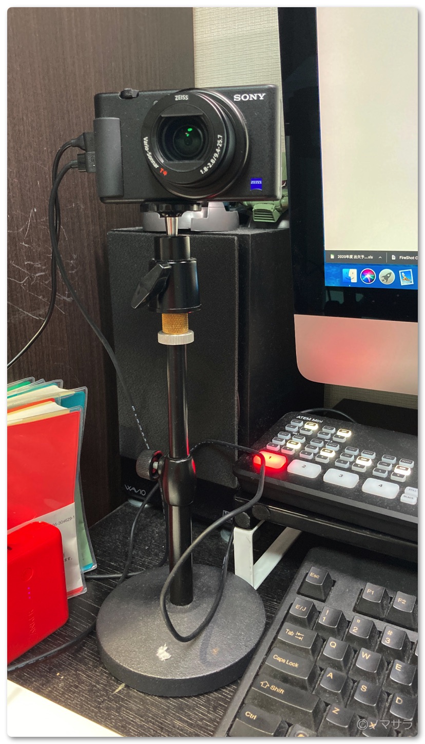 特にWebカメラをデジタルカメラにすると背景が適度にボケた雰囲気のある映像を配信することができます。その際、カメラを設置するのに便利なのがマイク用のスタンド。カメラを立てる際は通常三脚を使いますがテーブルの上に足を広げなければならない三脚を置けるスペースはまずありません。