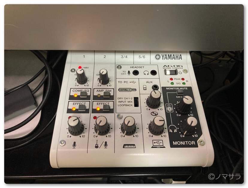 このミキサーの一番の特徴はループバックができるということ。iMacでかけている曲をそのままBGMとして流しながらWeb配信ができるようになります。これができるミキサーはほぼ皆無のためこのAG06やAG03が爆発的に売れています。ワタクシが購入したAG06は6チャンネルまで音声をミックスできるためもう一本マイクを増やしたり楽器やiPhoneなどの音を取り込むことができます。