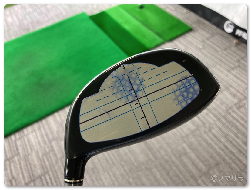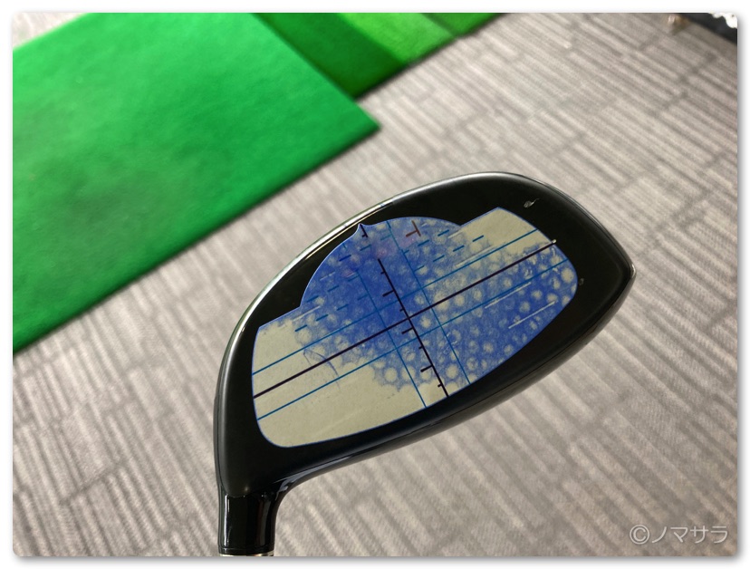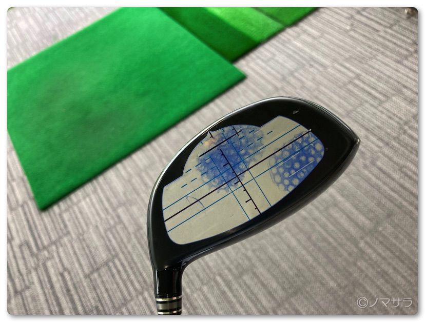 そこで使ったのがフェイスのどこに当たっているかをチェックできるインパクトステッカー。ボールが当たったところは青く色がつくため打点が視覚化されミスの傾向がわかります。