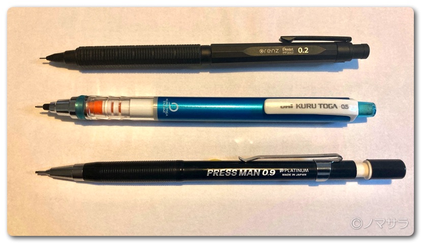 参考までに3,000円も出して買ったのに使用頻度がほとんどないオレンズネロ0.2mmと普段愛用しているクルトガ0.5mmとこのプレスマン0.9mmを比べてみました。