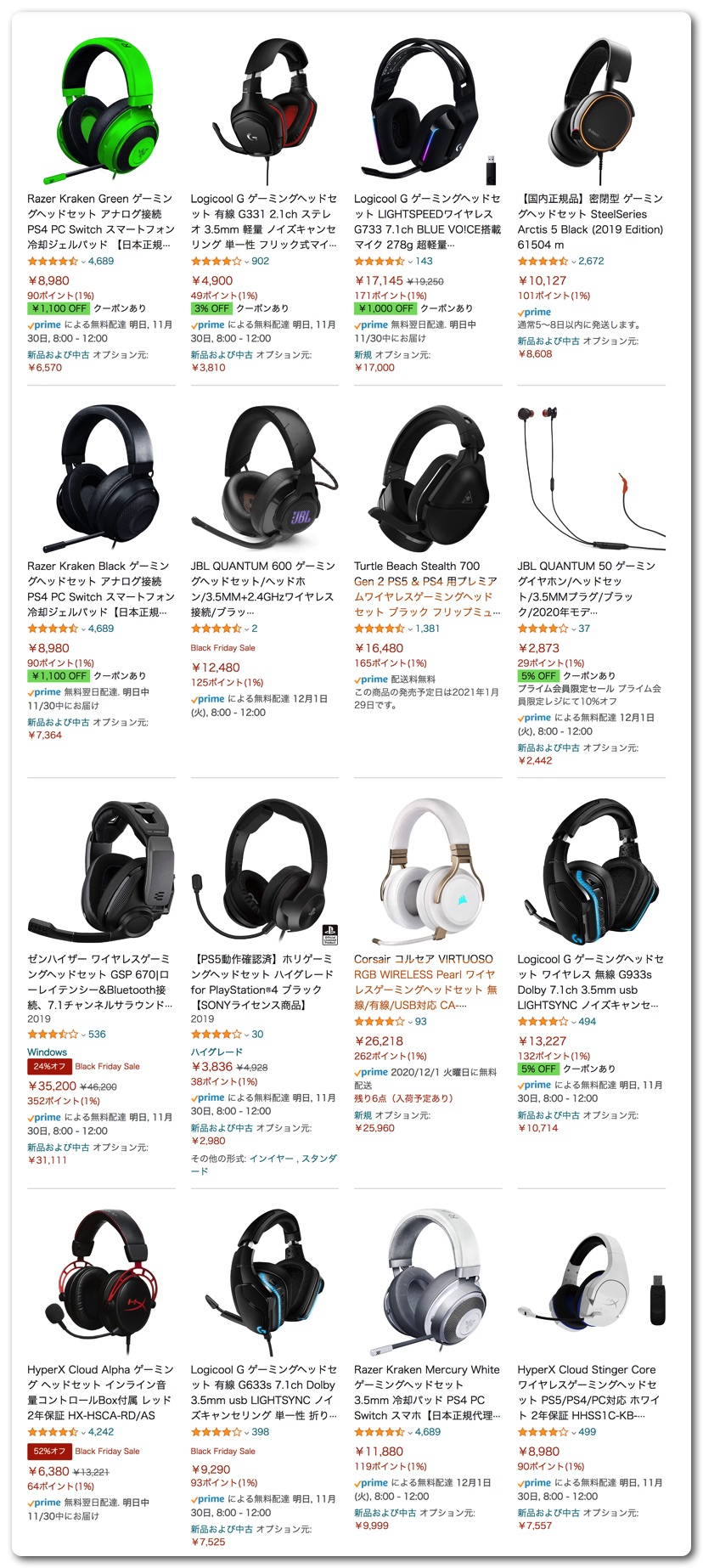 ゲーミングヘッドセットをそのまま検索。中華製のヘッドセットが出てきます。
