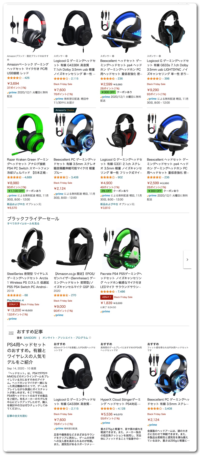 試しにイヤホンとゲーミングヘッドセットで比較してみましたが魔法の呪文を入れたら大手メーカーの商品のみに絞れて表示されるようになりました。