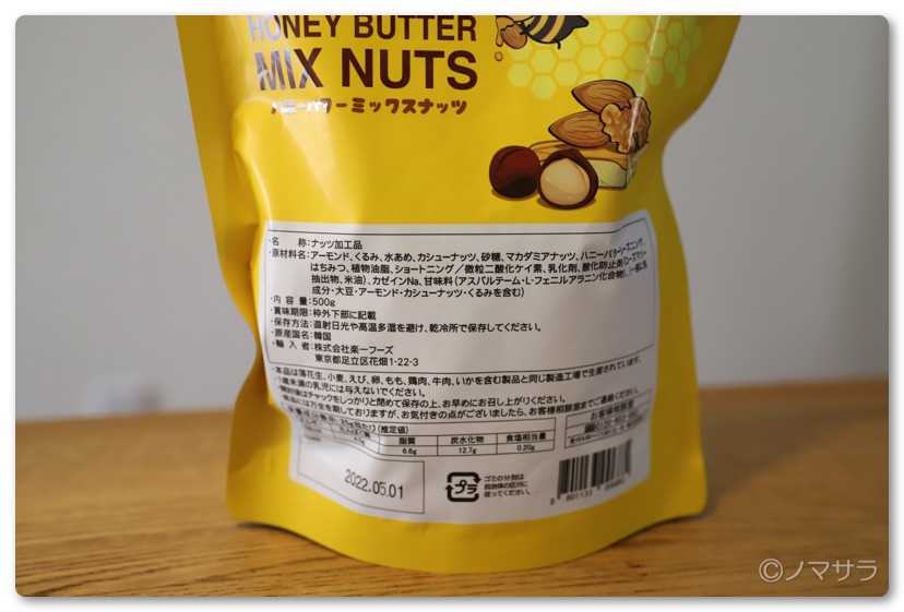 原材料を見ると身体には良くない物質も少々入っていますが、このぐらいのものなら許容範囲内かと。アーモンド、くるみ、カシューナッツ、マカデミアナッツなどのナッツにはちみつバターがコーティングされており程よい甘じょっぱさが病みつきになります。