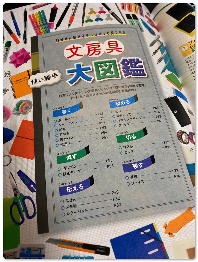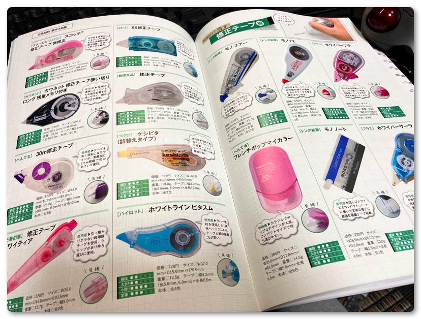 後半では文房具大図鑑として「書く」「消す」「伝える」「留める」「切る」「残す」のカテゴリーごとに様々な文房具が紹介されていました。同じ種類の修正テープやふせんが様々な特徴を持っており各社の企業努力がよくわかる特集となっています。