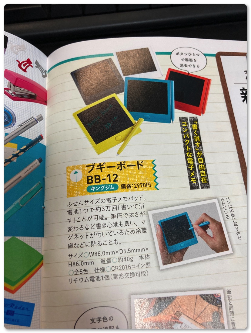 すでに使っていて便利なのはデジタル文具の「ブギーボードBB-12」。ふせんサイズの電子メモパッドでパッと書いて、パッと消せるので仕事場でメモとして重宝しています。