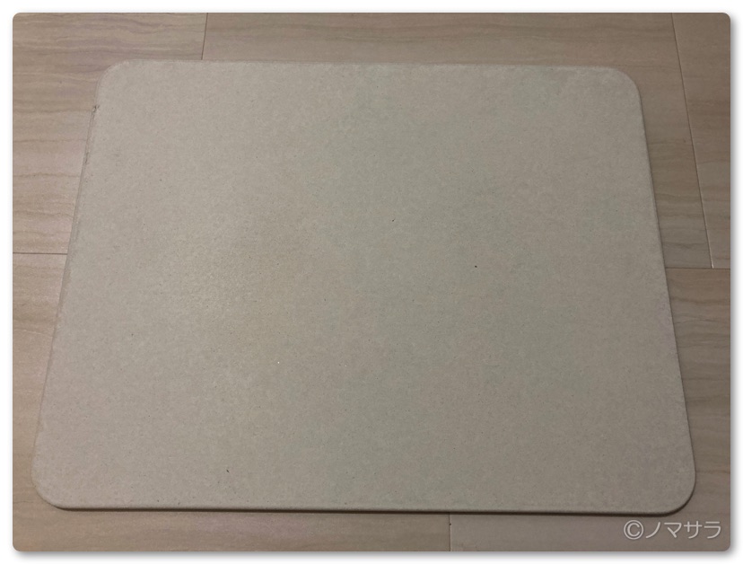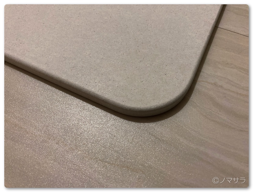 今回購入したのは43cm☓55cmで厚さは0.89cmで重量は2.2kg。縁は滑らかに面取りされているので角に触れたとしても安心。もしまだタオル生地のバスマットを使っている方は「珪藻土バスマット」に変えてみてください。利便性が著しく向上します!