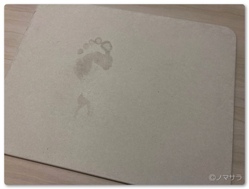 実際に使ってみましたが、かなり身体が濡れた状態でこの「珪藻土バスマット」に乗っても足元の水分はあっという間に吸収されて足の裏がサラサラになります。乗った直後は足型が付きますが次踏んだ場所は全く足型が付かないほど乾いています。今まで体験したことがない不思議な感覚。