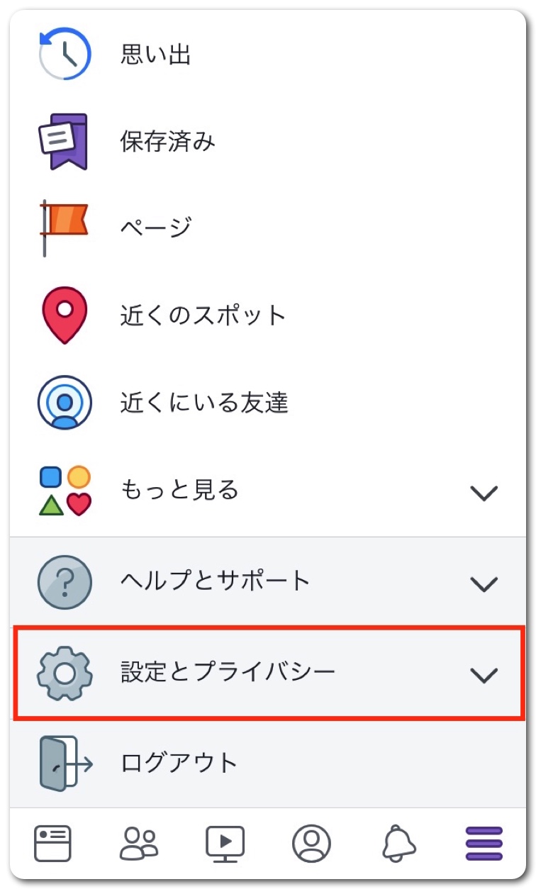 Facebookアプリ右下の三本線のアイコンをタップ。その後下へスクロールします。