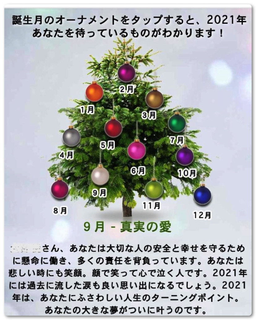 先日も「誕生日月のオーナメントをタップすると2021年あなたを待っているものがわかります!」というスパムアプリを使っている方がおられました。こういった診断系のスパムアプリ使う人はどんどん友達から削除していますが新たに繋がった人もいるためゼロにはなりません。