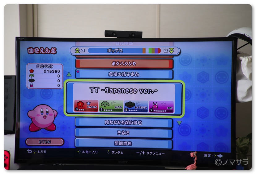 難易度は曲やモードによっても変わりますが、自分が選ぶキャラクターによっても変えることができます。カービィを選ぶと判定が甘くなり打つタイミングが少しずれてもすべて「良」判定になり高得点が出やすくなります。ただし慣れてくると面白くないので通常モードがオススメ。