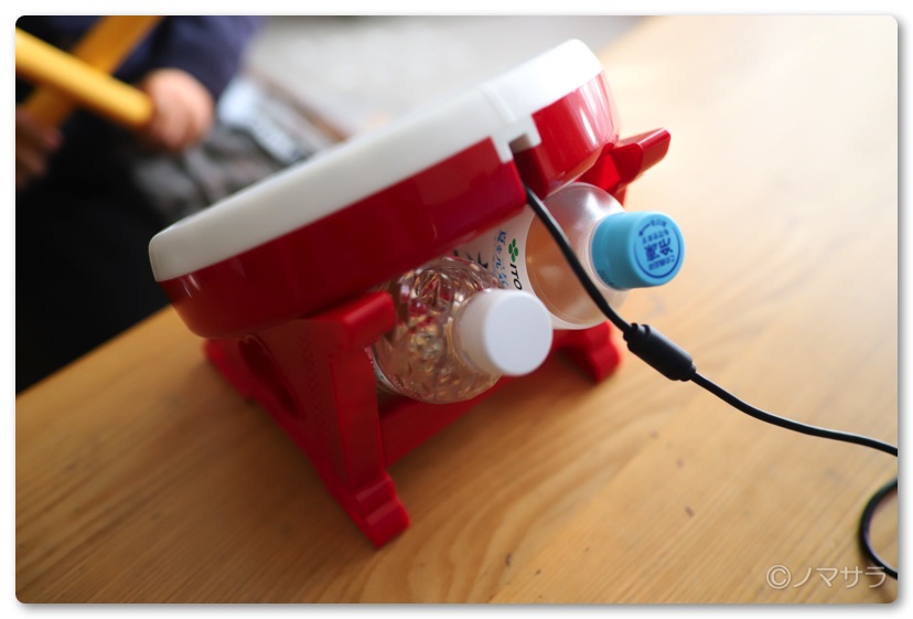 早速、専用コントローラーを組み立てて遊ぶことに。コントローラーは思っていたより大きくてしっかりしておりバチで叩いても十分耐えられるクオリティになっています。ただしそのままでは重量が軽いためコントローラーの隙間に500mlのペットボトル2本をウエイトとして差し込めるようになっており、これにより安定感が増します。細かい点ですがよく考えられています。