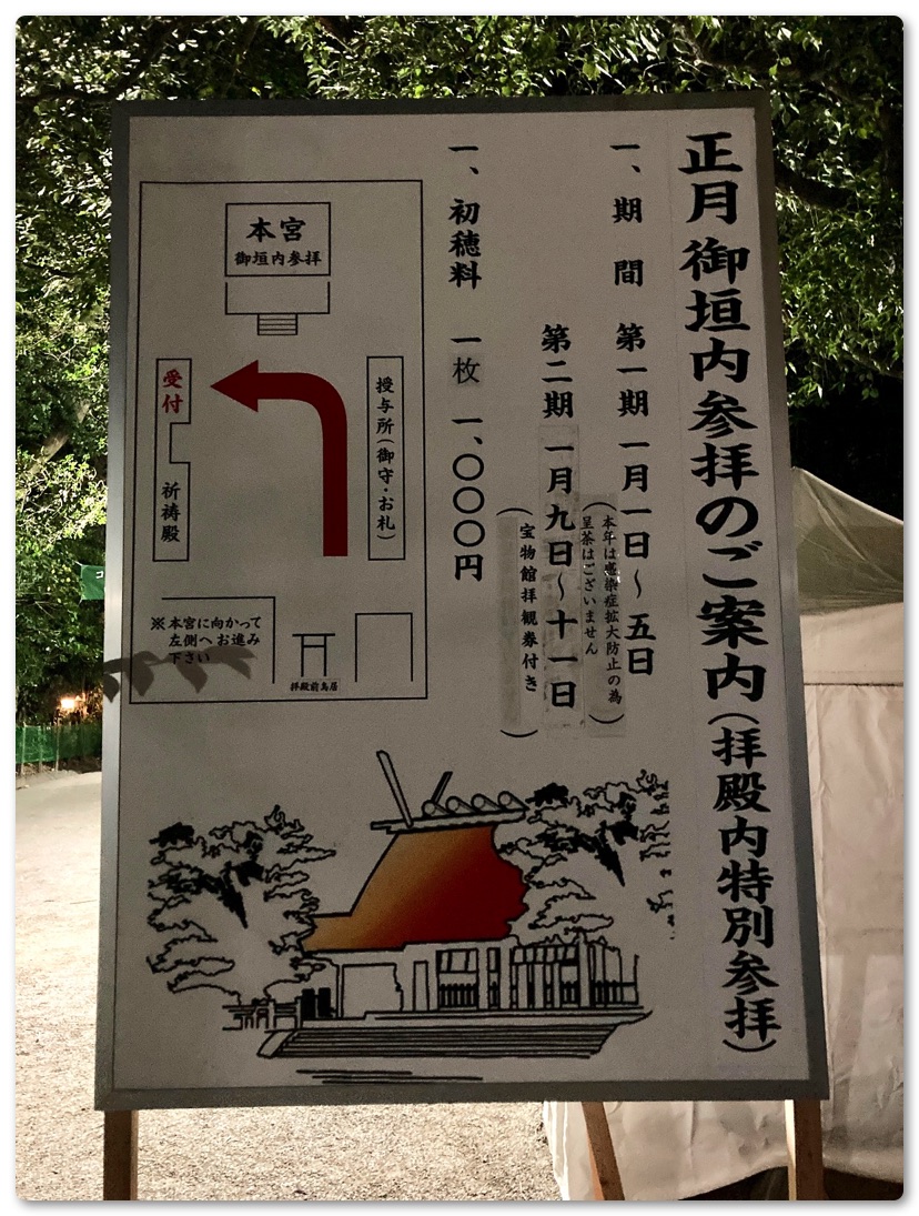 新春の御垣内参拝は、普段1万円の参拝料が千円かつ、お菓子と宝物館のチケットが付いてくる、超お得な期間。