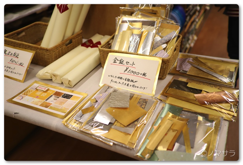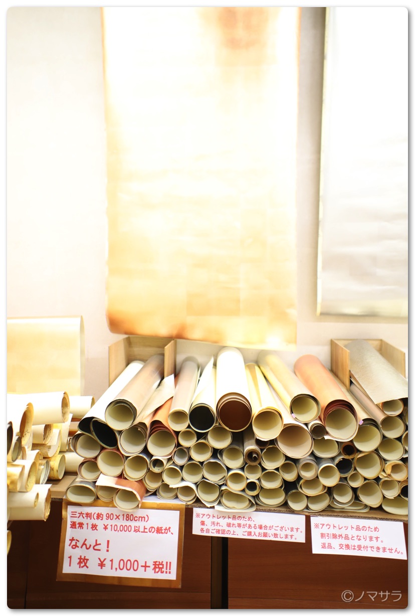 また1階の奥にはカルトナージュ、クイリングをはじめ、紙細工にまつわる雑貨なども色々置いてあります。また時期によってはセール商品などが並んでおり、お値打ちに購入することができます。訪れた時は金紙、銀紙のアウトレットセールが開催されており壁紙で使えるような大きな紙が1,000円という破格値で販売されていました。