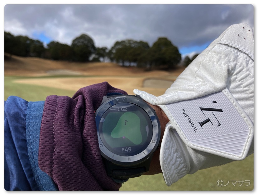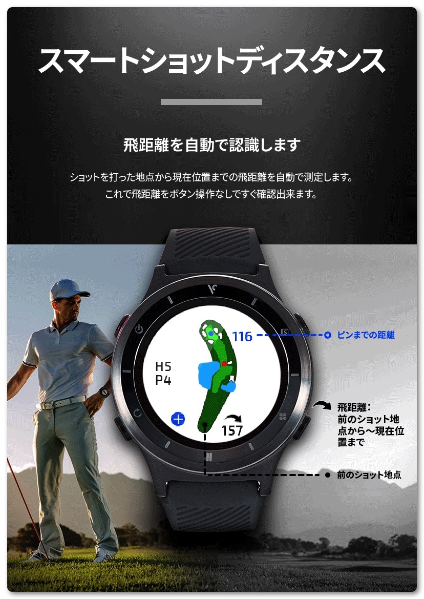 またショットを打った地点からボールが飛んだ現在位置までの飛距離を自動で測定してくれます。これにより飛距離をボタン操作なしですぐに確認できます。