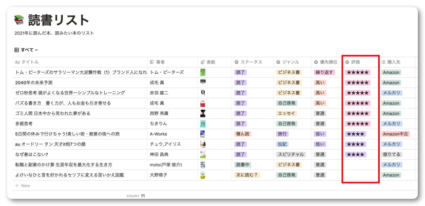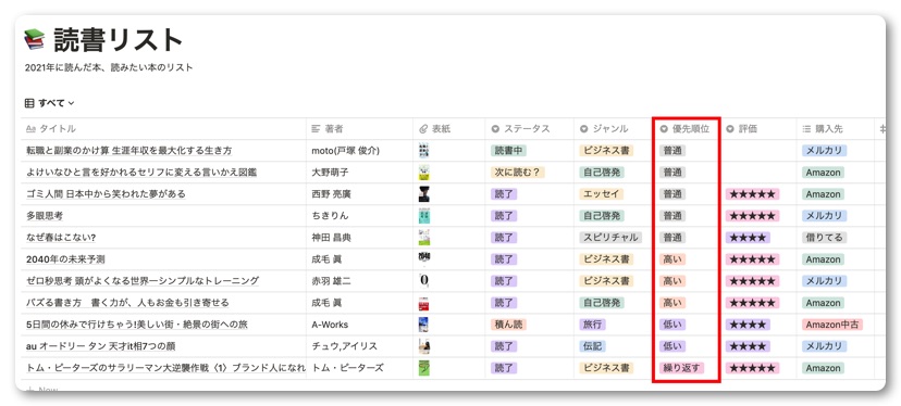 Notionの最大の特徴は記録した情報の見た目を簡単に変えることができ、それぞれのタグをソートできることにあります。例えば読書リストの評価を星の多い順から並べたり、購入したけど読んでない本の優先順位の高い方から並べるということが簡単にできます。