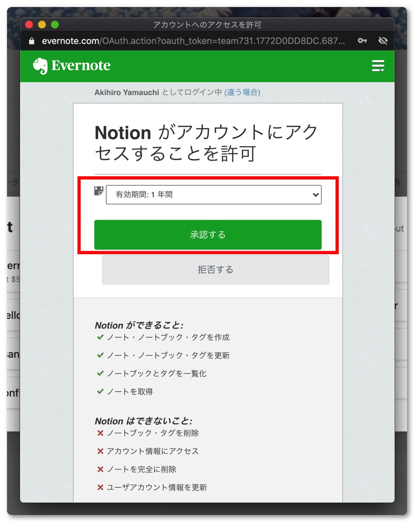 Notionがアカウントをアクセスすることを許可で承認するをクリック。アクセスできる有効期限は1日から色々選択できます。