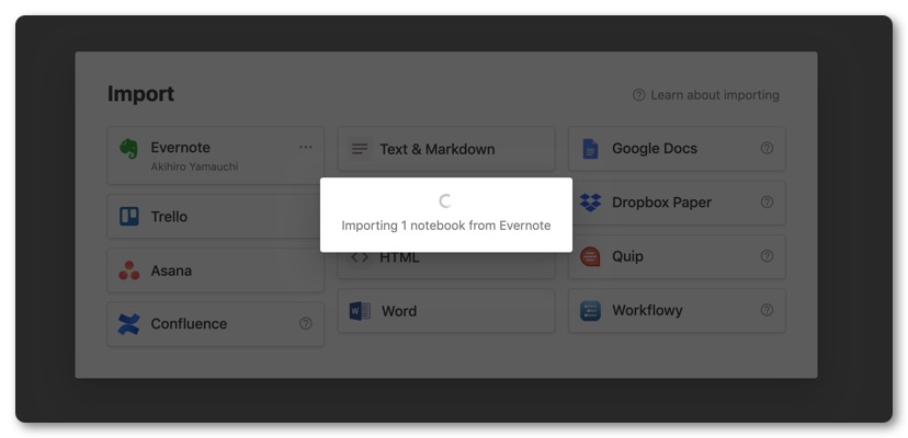 翌日、再度試したら移行することができました。時間帯などによって違うのかもしれません。今後のアップデートにより移行できるようなるかもしれませんが…。しばらくは上手く行かない場合は時間を空けて何度か試してみるといいと思います。なお、移行できるデータはテキストのみで画像は入りません。現時点では画像付きのメモはEvernoteへ。テキストデータはNotionへという運用がベストでしょう。