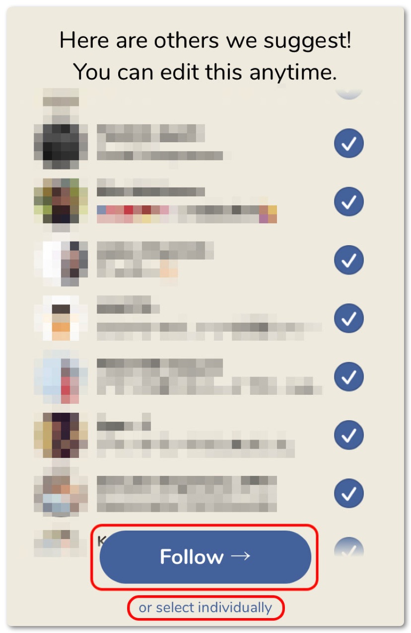 続いてClubhouseが人気のある人のフォローをオススメしてきます。そのまま選ぶ場合は「Follow」を自分で選択したい場合はその下の「or select individually」を選択します。