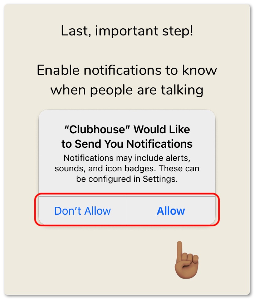 Clubhouseの情報の通知を許可するかどうかを聞いてきます。通知をオンにしておけば新しいルームが始まったときなどに連絡が来ます。