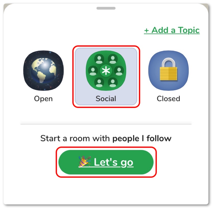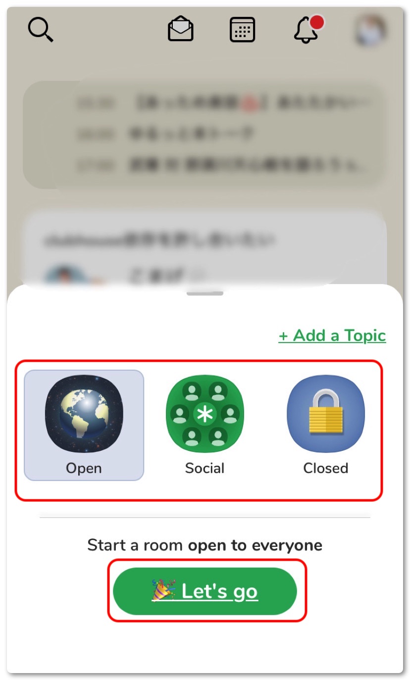 「Open」と「Social」はそのまま「Let’s go」をタップすればルームが作成できます。+Add a Topicでタイトルや内容などを記入しておきましょう。キャッチャーなタイトルなら参加者が増えます。