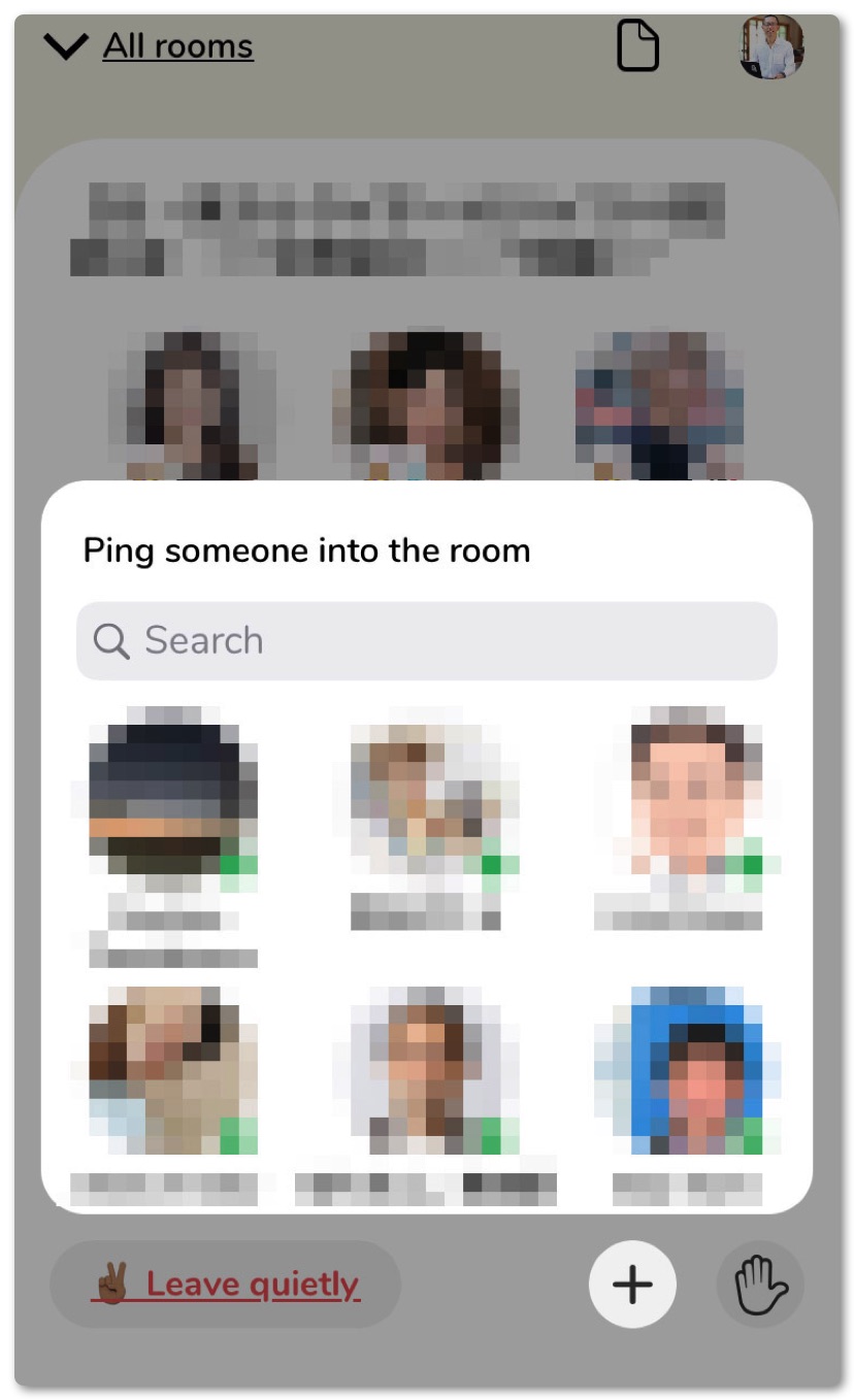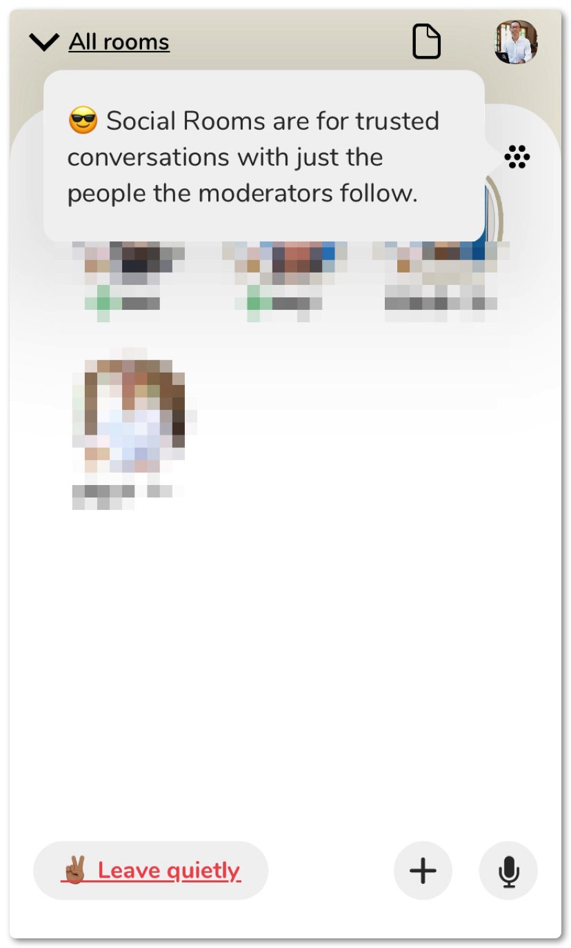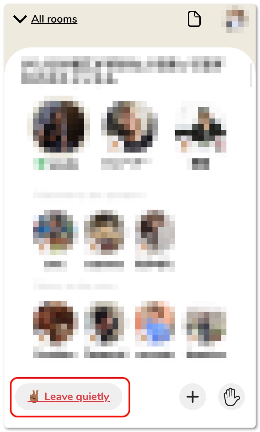 「Leave quietly」を押せばルームから退出できます。オーディエンス(聴くだけ)の立場なら勝手に抜けても全然問題ありませんがスピーカーの立場で突然いなくなるのはマナーとしてあまり良くないような気がします。もしスピーカーになっている場合は一言抜ける旨を伝えてから退出しましょう。