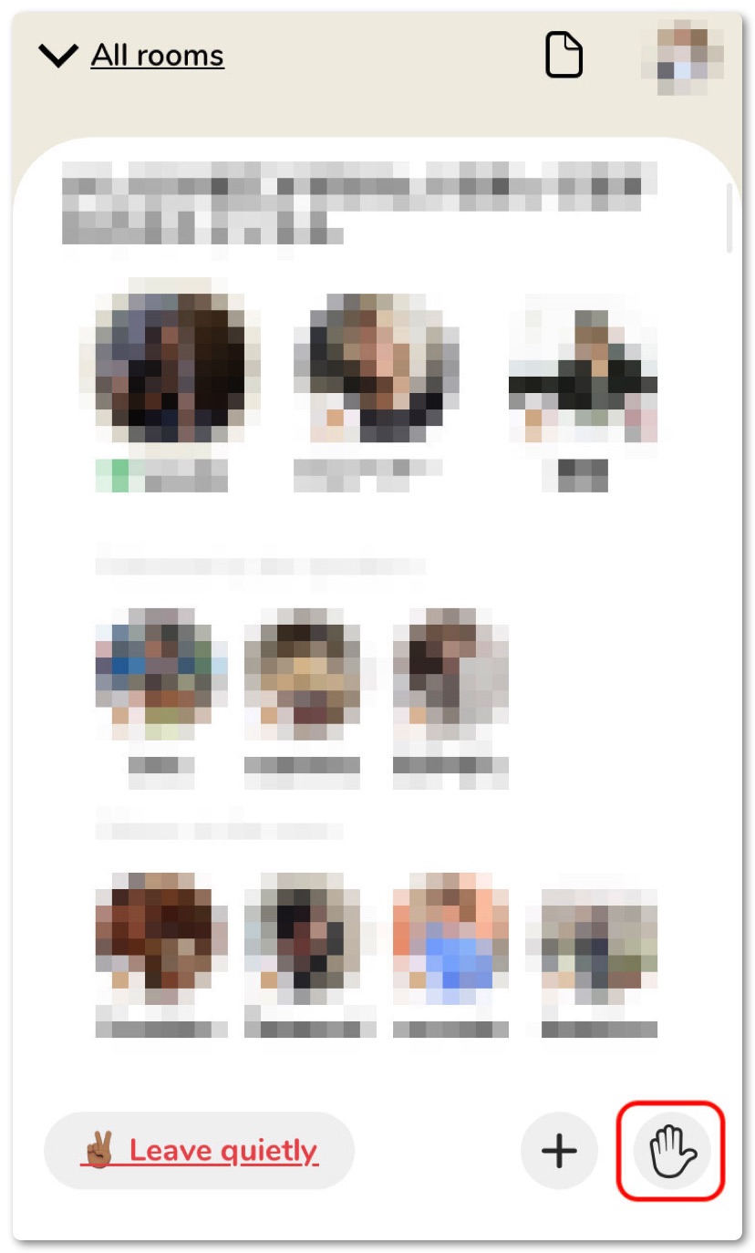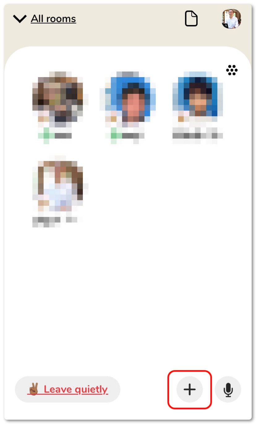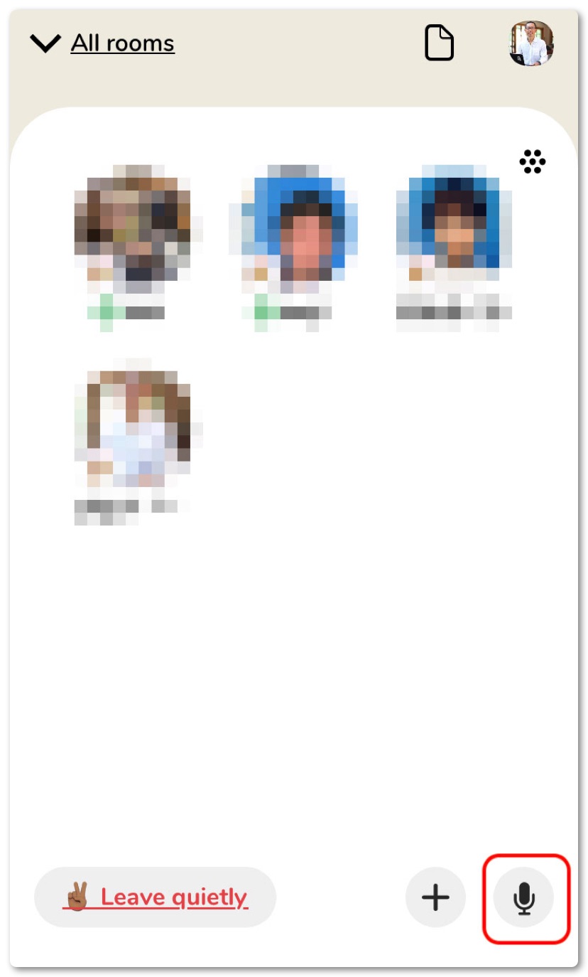 中に入って、音声を出したくない場合はミュートボタンがありますのでここをタップしておけば自分の声がルームに届くことはありません。Zoom同様、適宜切り替えて使うといいでしょう。ただし、Zoomと違って音が重なっても違和感がなく実際に話しているのとほぼ変わらないので周囲がうるさくない環境であれば常に音声オンで構わないと思います。