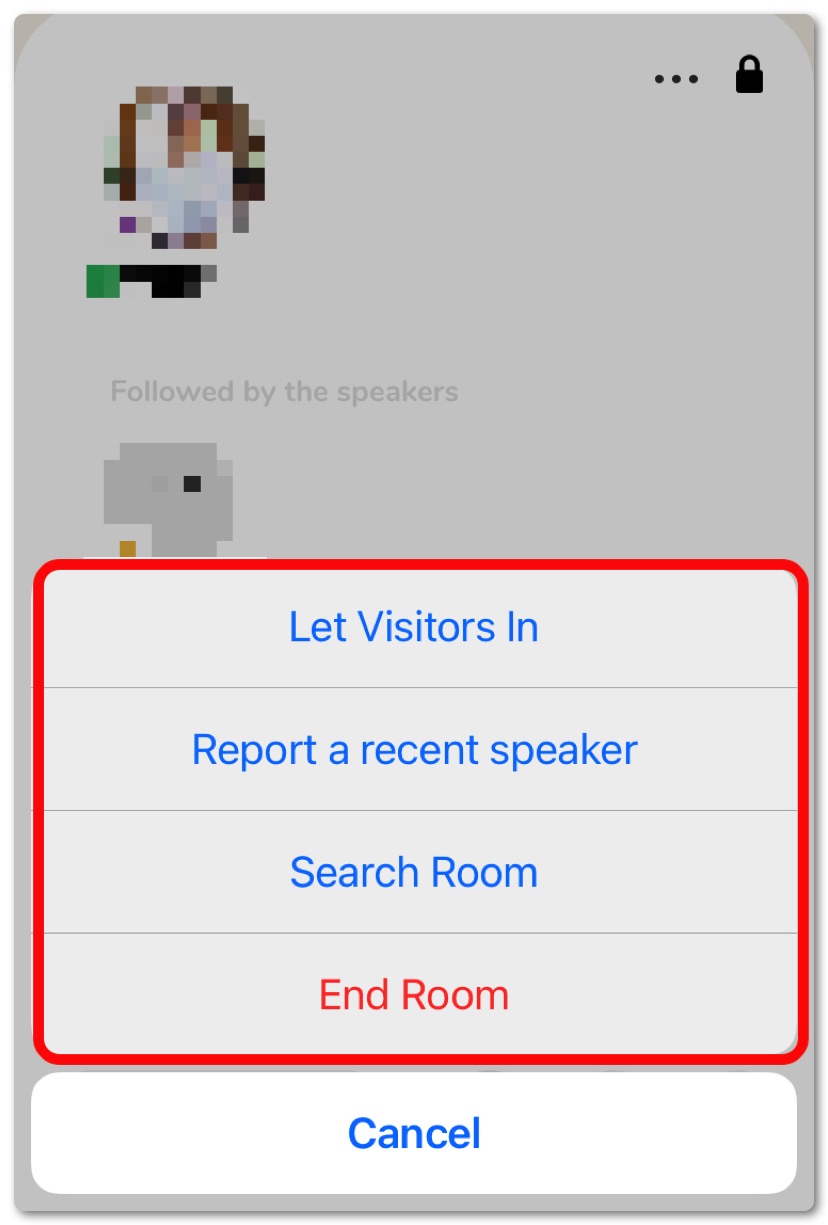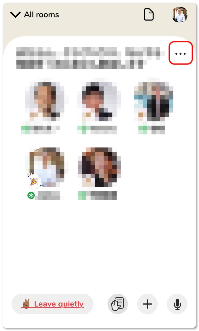 モデレーターの場合、右上に「…」と表示されますが、ここはルーム全体を終了したり参加者を新たに入れたりするためのメニューなので「End Room」と「leave quietly」と間違えないようにしてください。モデレーターを複数にしておけば主催した人が途中で抜けたとしても誰かがいればルームは継続されます。