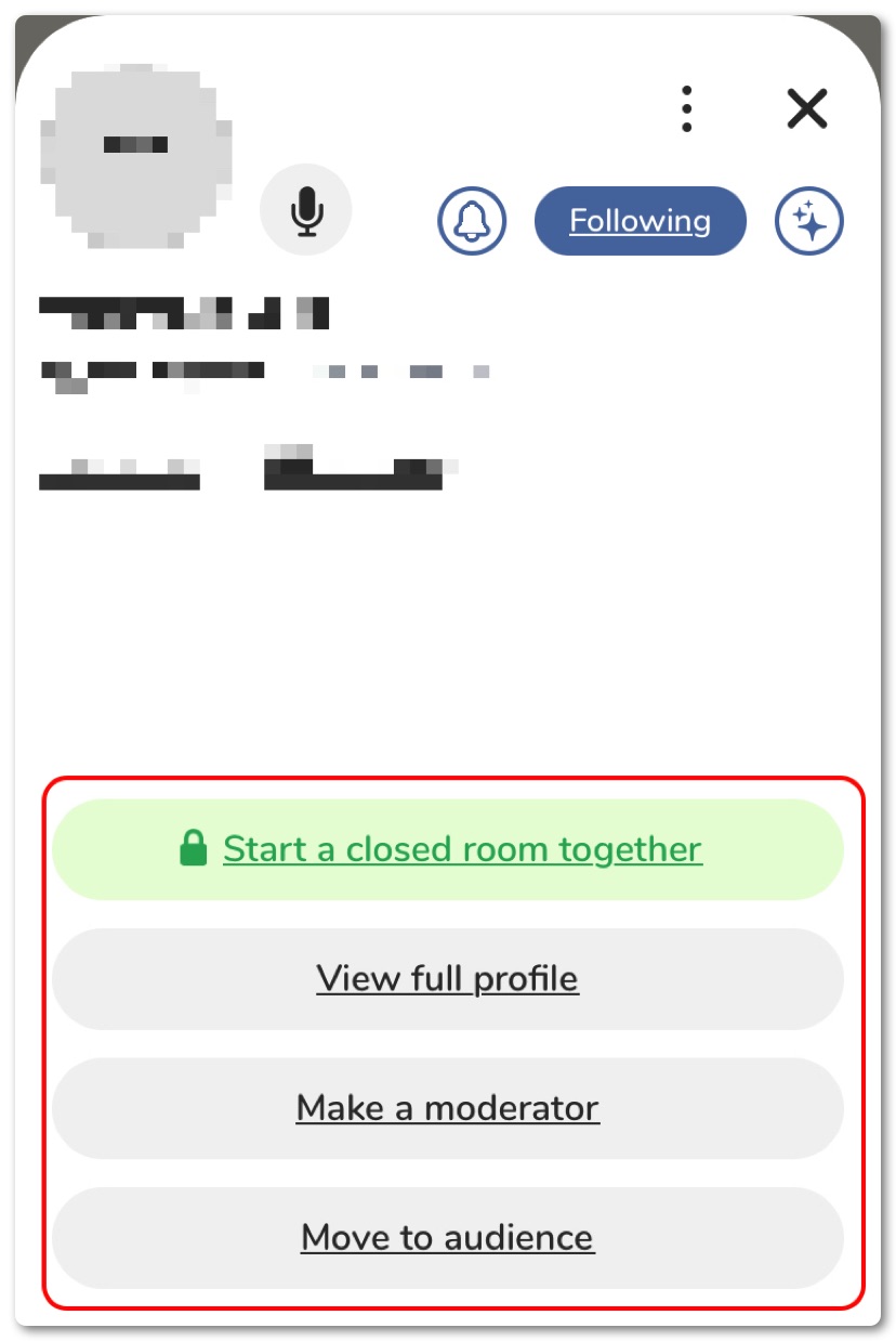 モデレーターの場合、参加者のアイコンをタップするとメニューが出てきて参加者をモデレーターに指定したり、オーディエンスをスピーカーに引き上げたり、逆にスピーカーからオーディエンスに戻したりできます。