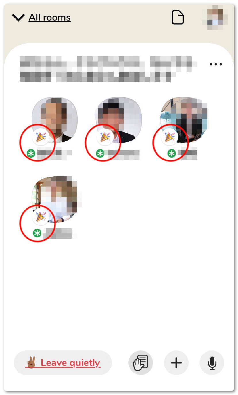 モデレーター(主催者)になるには自分でルームを作成するか、モデレーターから指名してもらいます。モデレーターになっている場合、アイコンの下に緑に白抜きの*のマークが付きますので、これで見分けることができます。写真のアイコンの下に表示されているクラッカーのマークは新人であることを表しています。このマークは利用を始めてから一週間経てば消えます。