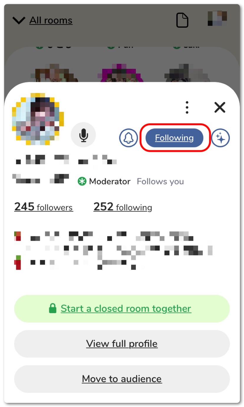 メイン画面の右下にあるBCG痕みたいなアイコンをタップするとフォロワーの方々の現在のステータスがわかります。今、どの部屋に参加しているのか、何分前までClubHouseにいたのかなどがわかります。怪しい部屋に入っているとバレることがありますのでご注意ください(笑)