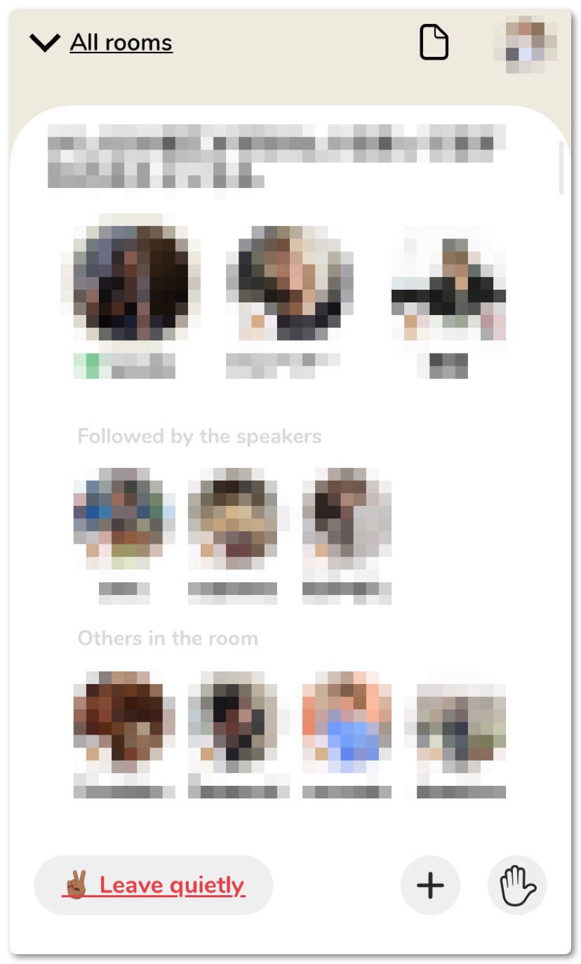 「Leave quietly」を押せばルームから退出できます。オーディエンス(聴くだけ)の立場なら勝手に抜けても全然問題ありませんがスピーカーの立場で突然いなくなるのはマナーとしてあまり良くないような気がします。もしスピーカーになっている場合は一言抜ける旨を伝えてから退出しましょう。