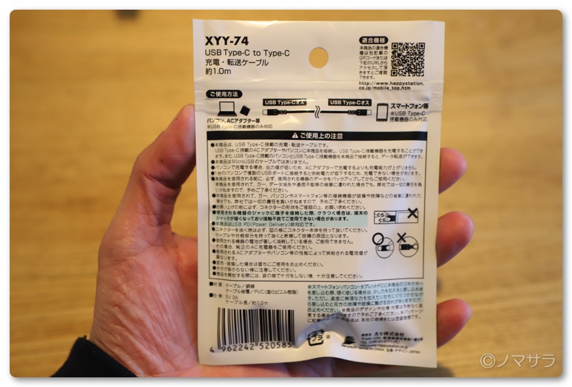 手持ちのUSB Type-Cケーブルは長くて太いものしかなく、持ち歩きに不便なので短めのケーブルを探していたところ百均のセリアでUSB Type-C to Type-Cのケーブルを発見。全長1.0mとちょうどいい長さ。コネクタはオス・オスなので充電やGoProなどのUSB Type-Cポートを搭載した機器からの転送が可能となります。
