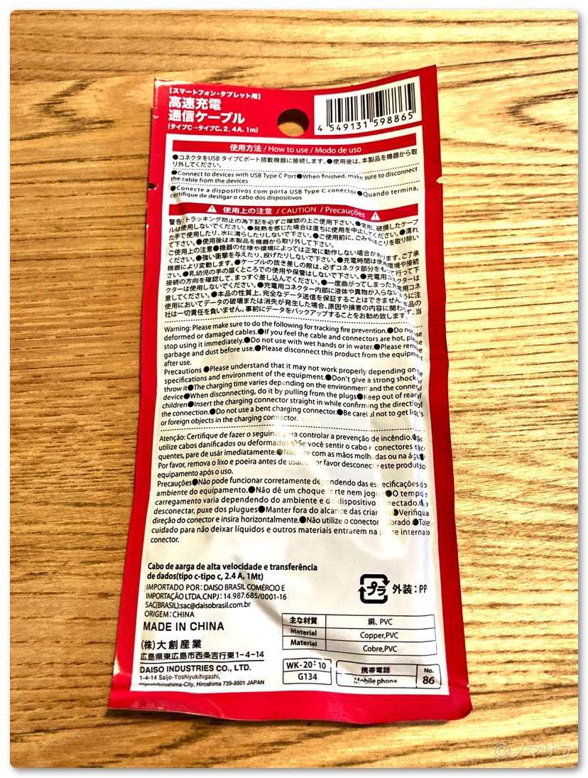 セリアのケーブルはPD充電には対応しておりませんが、その後訪れたダイソーのケーブルは高速充電対応でこちらを再度購入することにしました。M1 MacBookAirはバッテリーの持ちがめちゃくちゃいいので余程のことがない限り出先で充電することはありません。急速充電の必要性はほとんどないのですが、やはり充電が速いに越したことはありません。