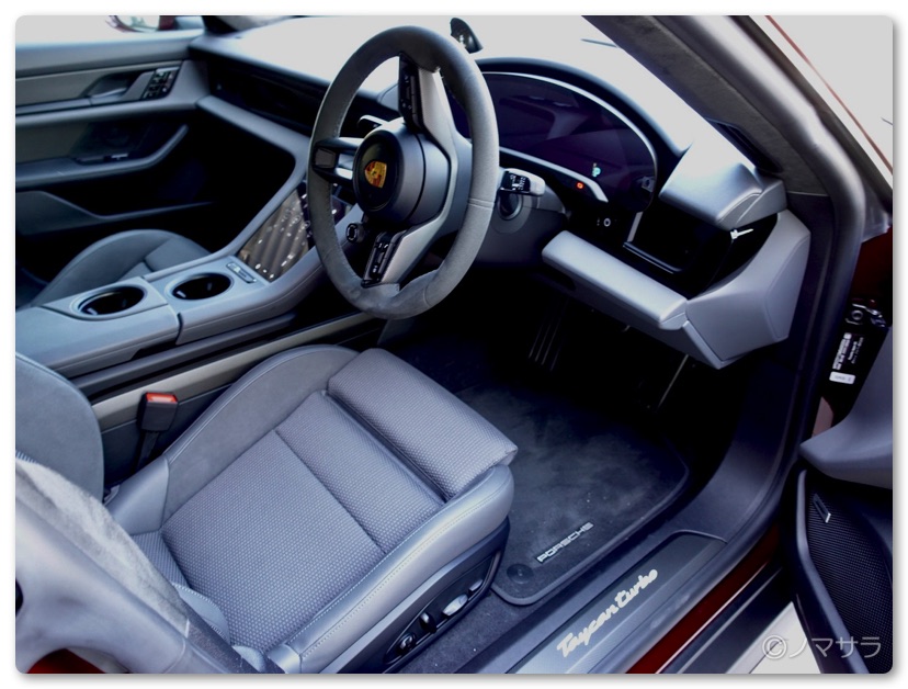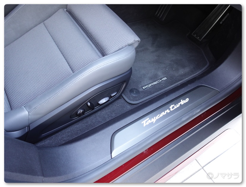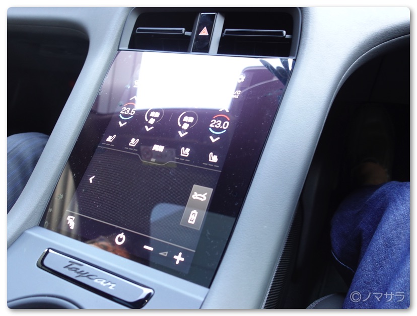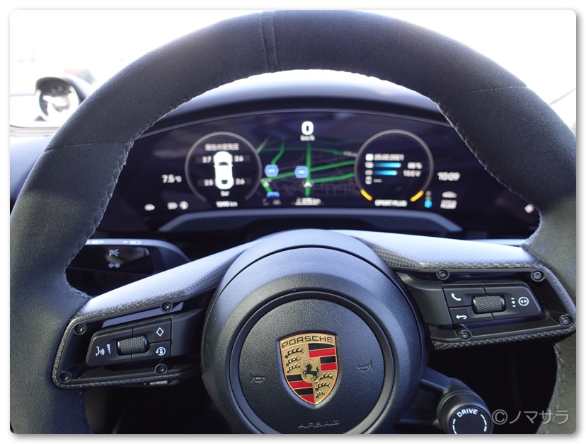 EVなのでエンジンはなくスタートはハンドルの右横にある起動ボタンを押して、ハンドル左横のレバーを下げるだけ。シフトレバーはなく、PDKのポルシェについているパドルシフトもありません。エンジンがないのでエンジンブレーキというものがなくモーターによる回生ブレーキになるのでシフトレバーがないとのこと。なるほど、なるほど。