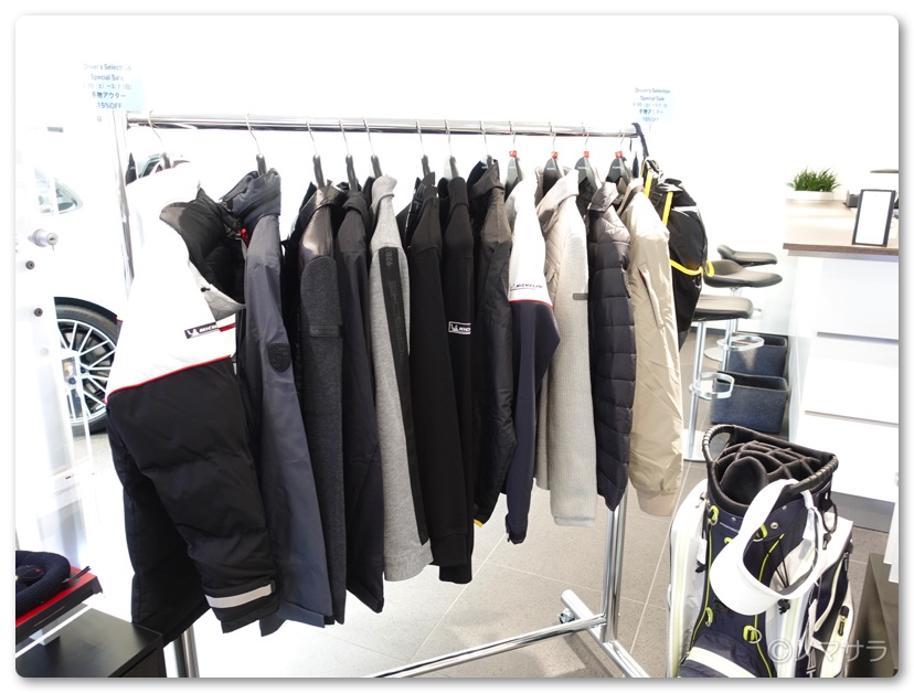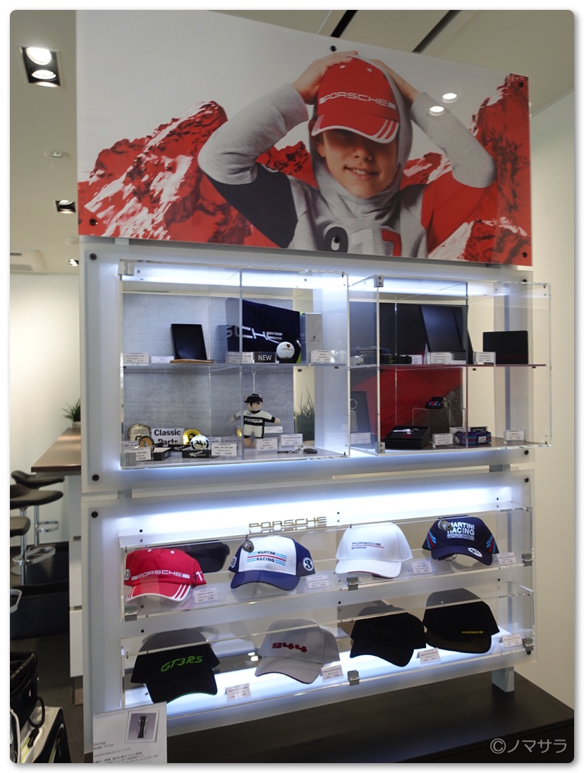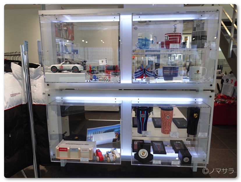 店内で試乗の契約事項にサインをして試乗スタート。なお、店内にはマグカップやキーホルダー、スポーツウェア、ゴルフのキャディバッグなどポルシェグッズが色々並んでいました。