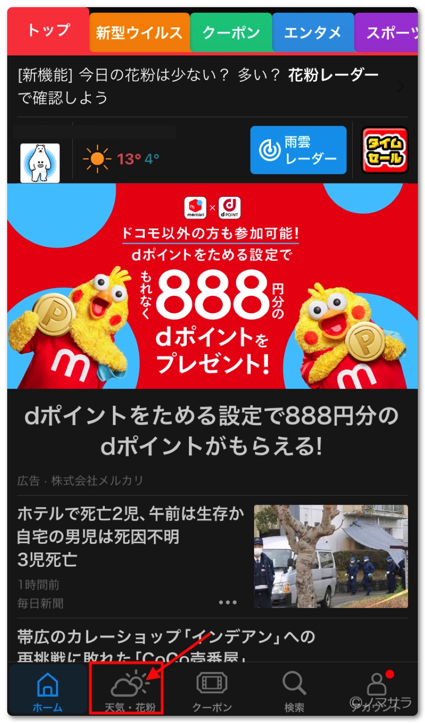 「SmartNews」を立ち上げ下のメニューから「天気・花粉」をタップ
