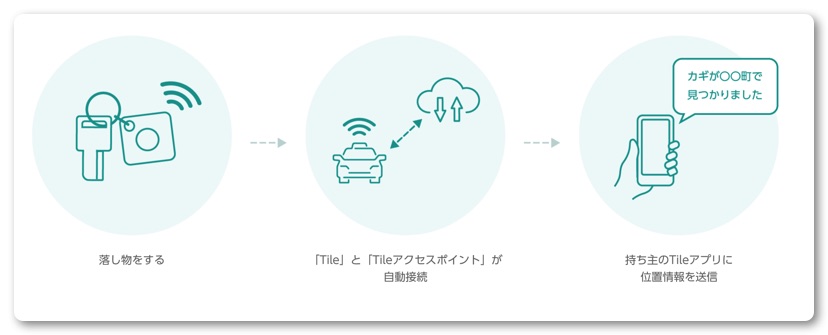 主要な都市部を走るタクシー約20,000台以上にTileにアクセスできる「JapanTaxiタブレット」が搭載されており、動くTileアクセスポイントとなっています。Tileを付けたモノがどこかへ行ったとしても近くを「JapanTaxiタブレット」が搭載されたタクシーが通過すればTileの位置を把握し通知してくれます。