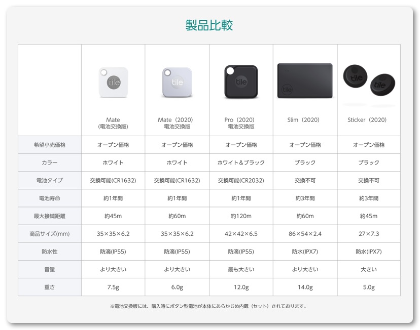 オススメはワタクシが使っている「Tile Mate電池交換版」。電池は1年ほどしか保ちませんが電池交換ができますので長い間使うことができます。価格は約2,000円と一番リーズナブル。旧型ならさらに200円ほど安くなります。違いはBluetoothの到達距離が旧型は45m、新型は60m、重量が新型は1.5g軽くなっています。正直、どちらでも大差ないので旧型を選んでもいいと思います。